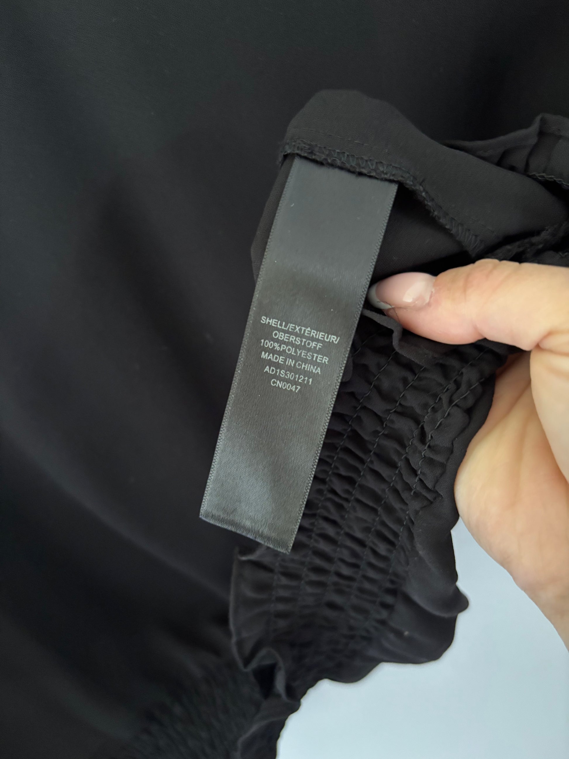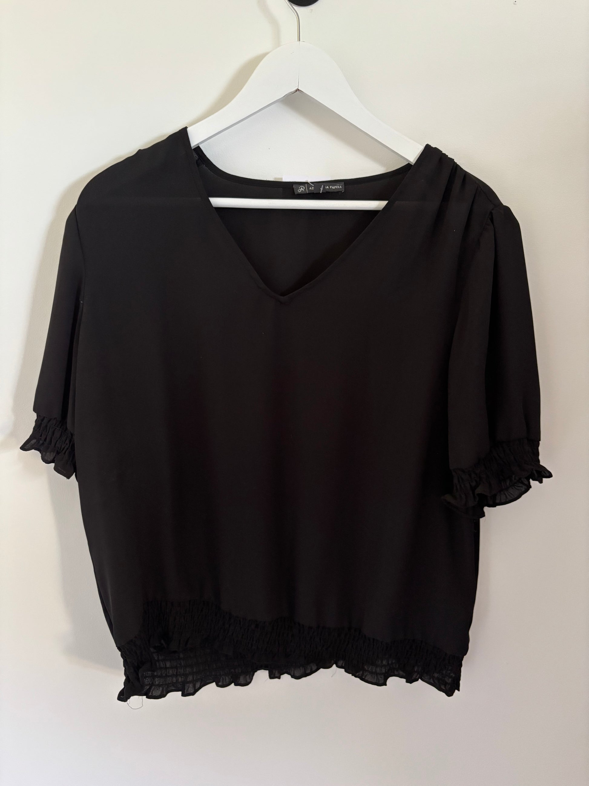 Slightly see-though top with an elastic/ruffle hem and arm cuff that hits above the elbow.