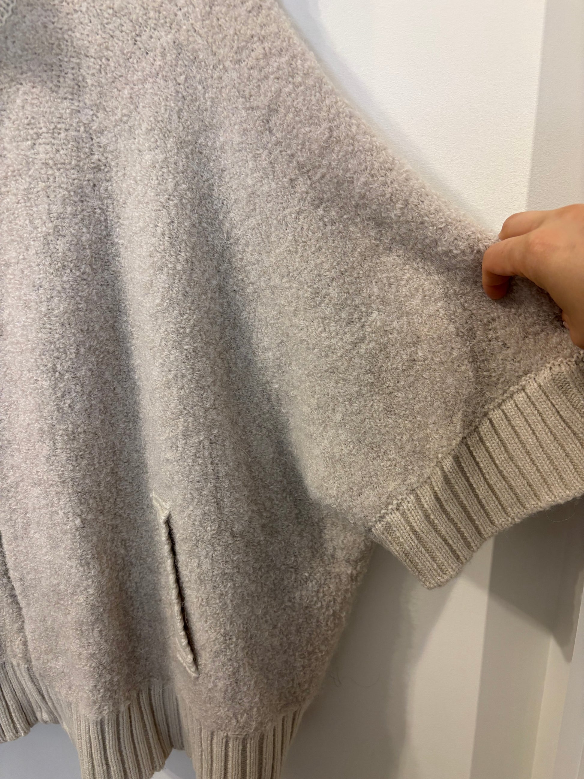 This cardigan is crafted from a material blend with wool and alpaca. It features a half long sleeve style, a high neck, long sleeves and a zip. This item is available in one size only.