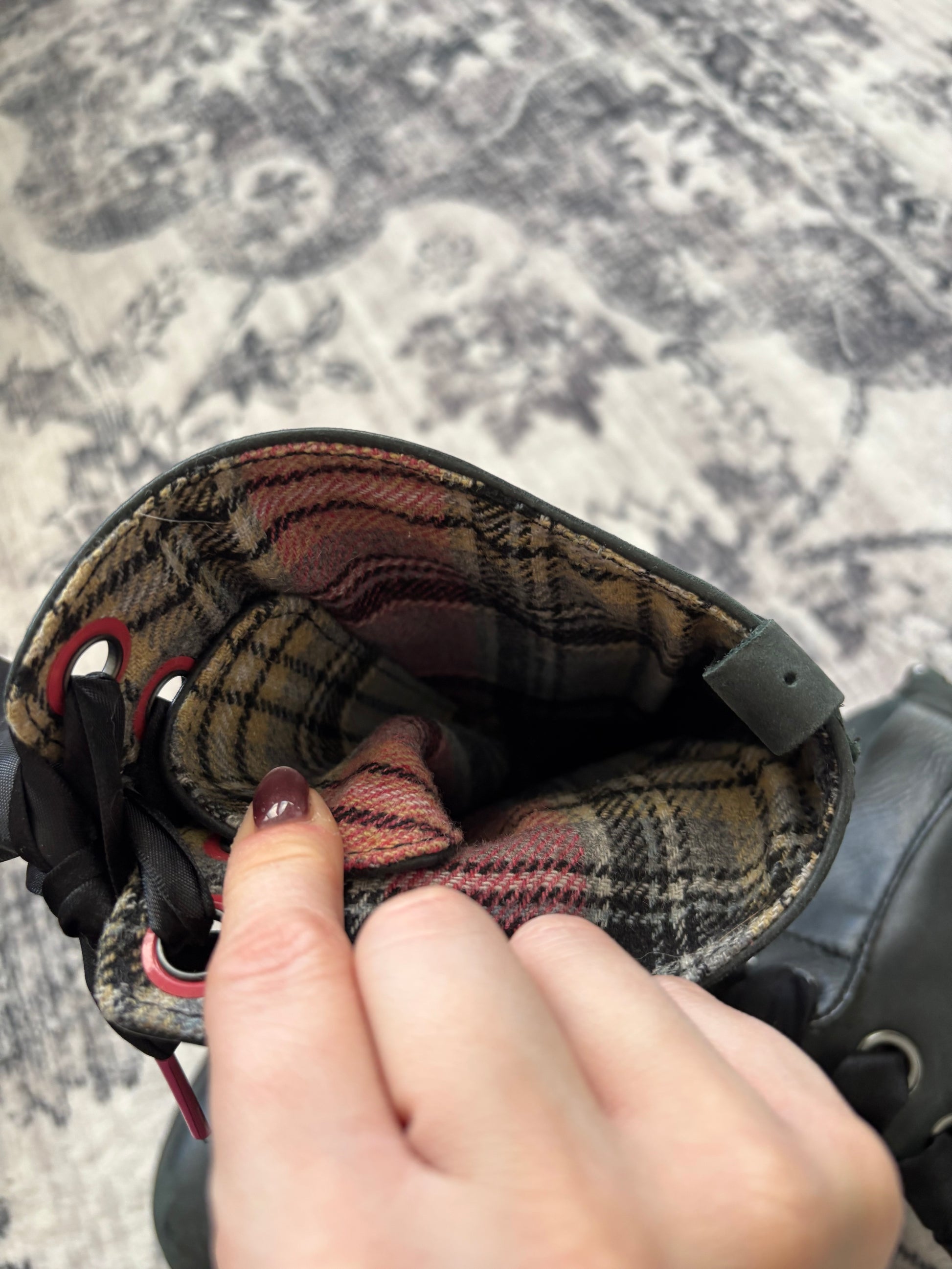 Details/Fit: Can be worn laced up or folded over to show the tartan plaid lining with wrap around laces.