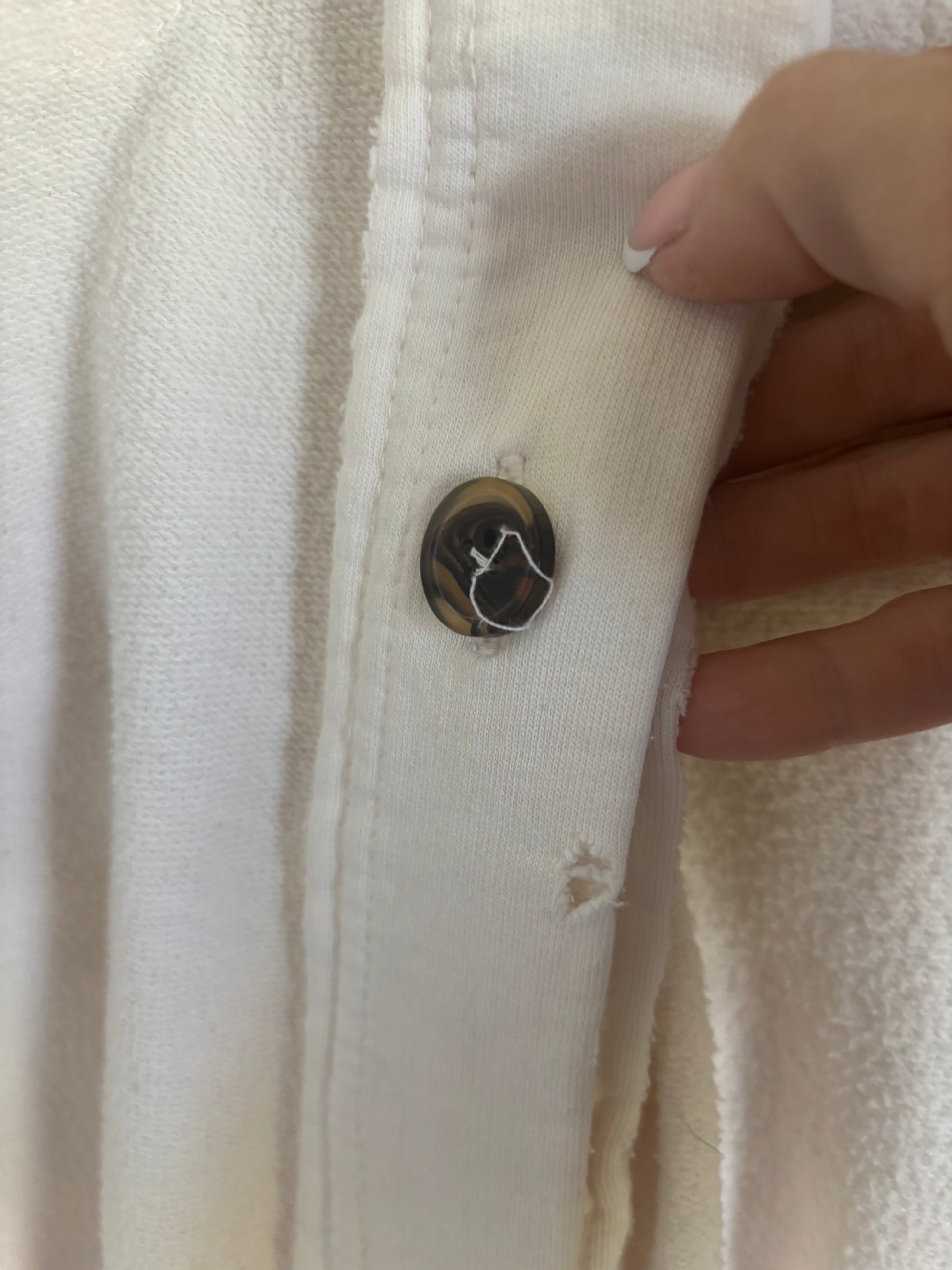 Features: Patched elbows and pockets, button-front closures, unfinished, raw detailing