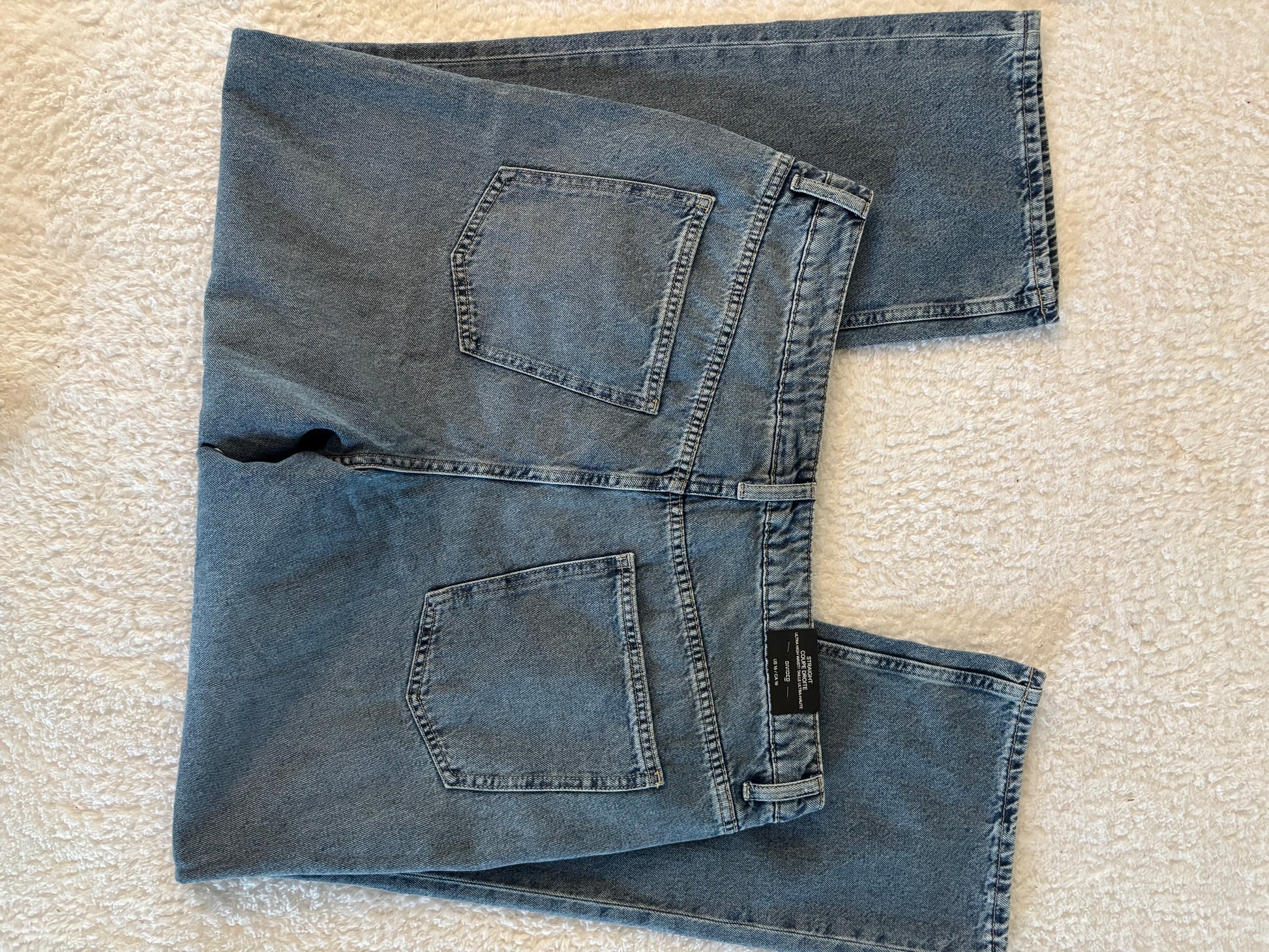 Details/fit: 5-pocket jeans in rigid cotton denim that feels firm at first, softening and relaxing with wear. Regular fit from waist to hip and a looser, straight cut from thigh to hem. Extra-high waist, metal chain details at front of waistband, and zip fly with button. Straight, regular-length legs, designed to fall at top of foot with little or no stacking. This classic shape complements everything from hoodies to blazers.