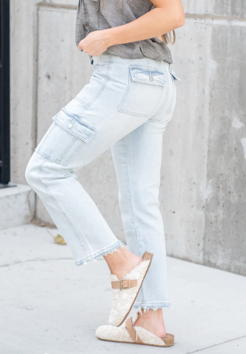 Stylish and functional, the High Rise Slim Straight Cargo Pants in Light Stone Wash feature comfort stretch fabric, side and cargo pockets, back pocket detail, and back dart design. The regular hem completes a modern and versatile look. Perfect for both fashion and practicality.