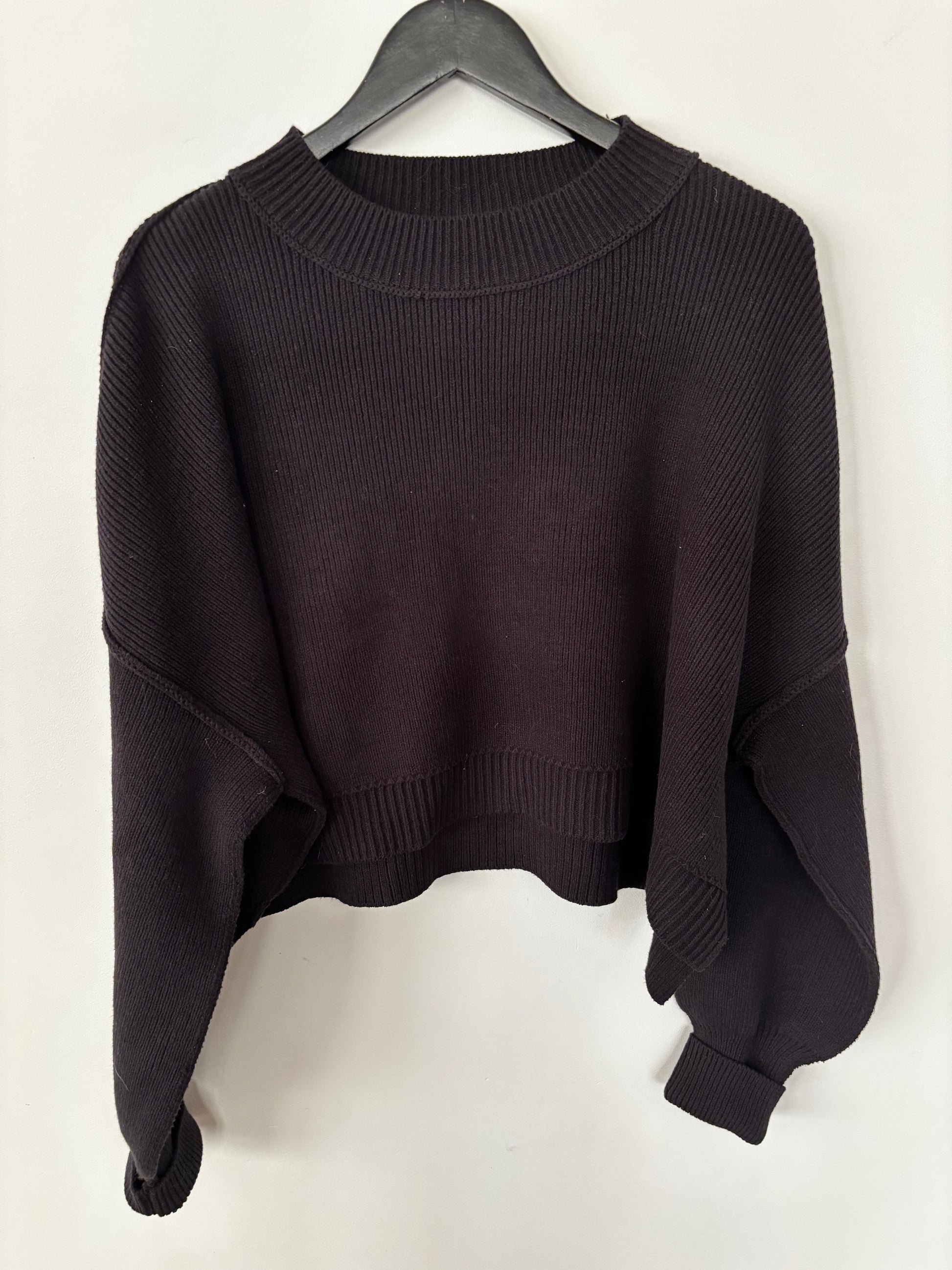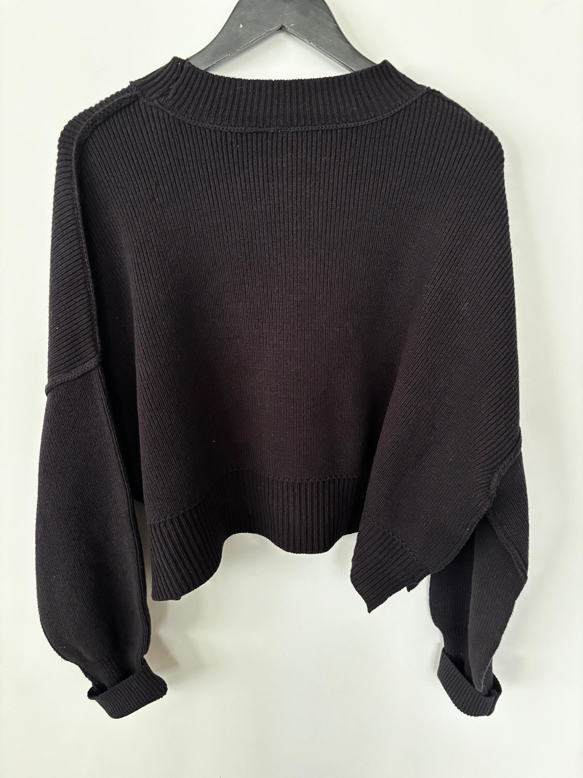 So cool and classic, this forever essential pullover sweater is featured in a slouchy, cropped silhouette and ribbed knit fabrication with mock neckline, defined seaming, and slightly exaggerated sleeves for added shape.