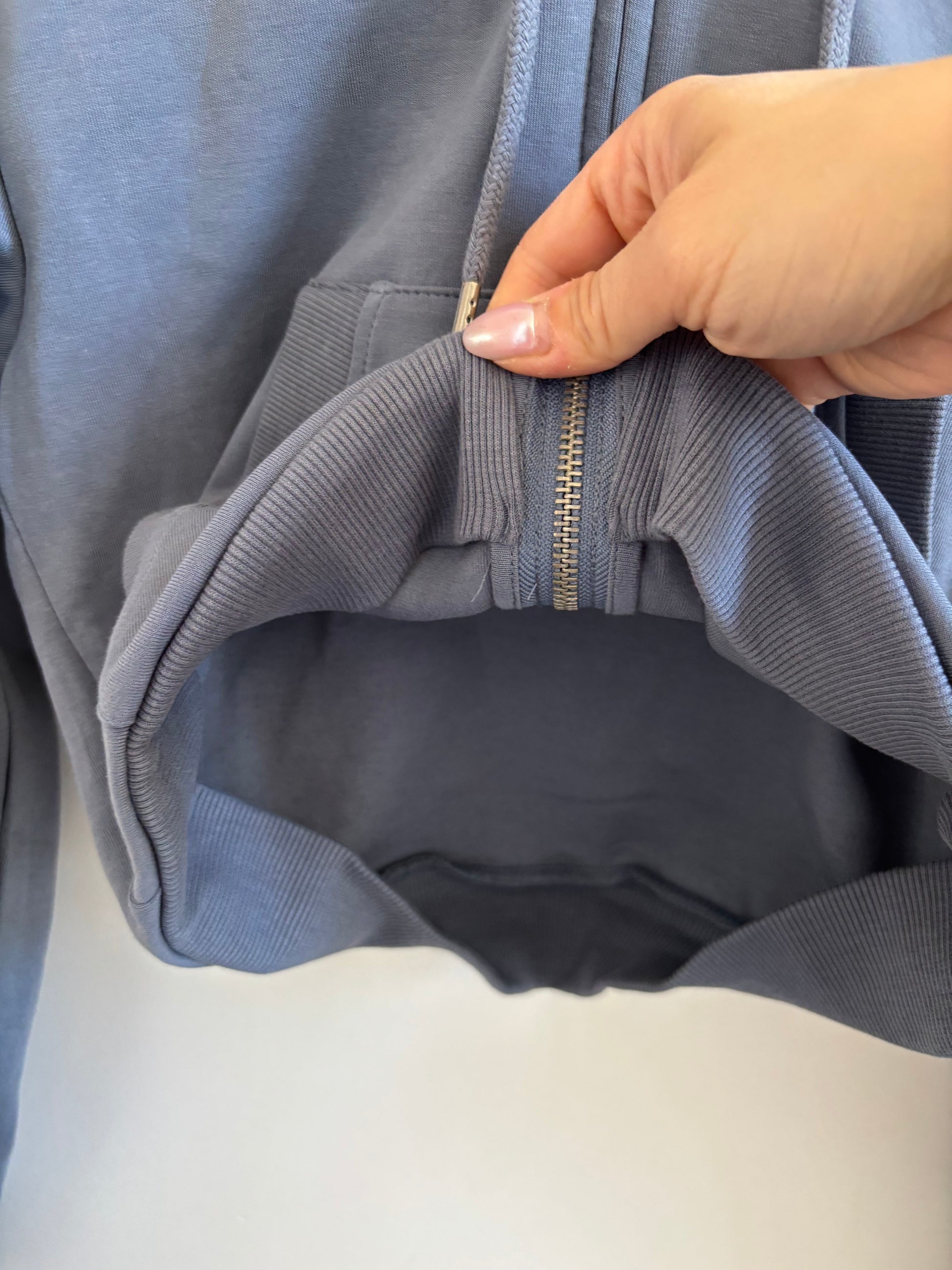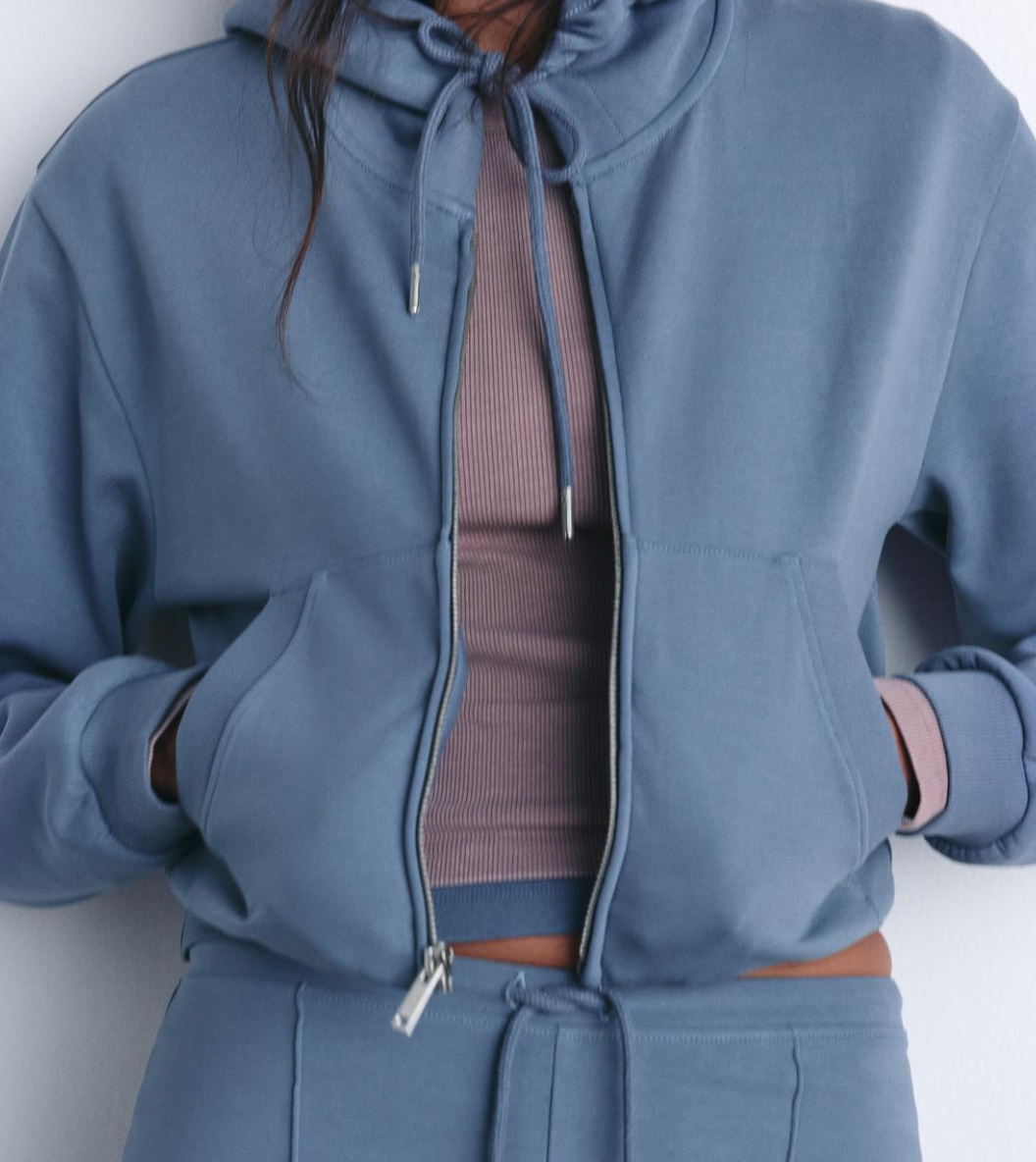 Size/fit: Cropped Hoodie (stitched at back on ribbed hem to create a "rolled up" look.