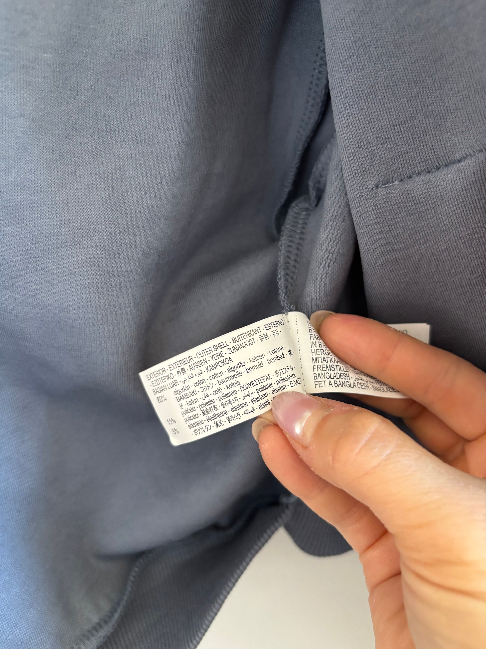 Materials: Composition and care: 80% COTTON, 15% POLYESTER, 5% ELASTANE