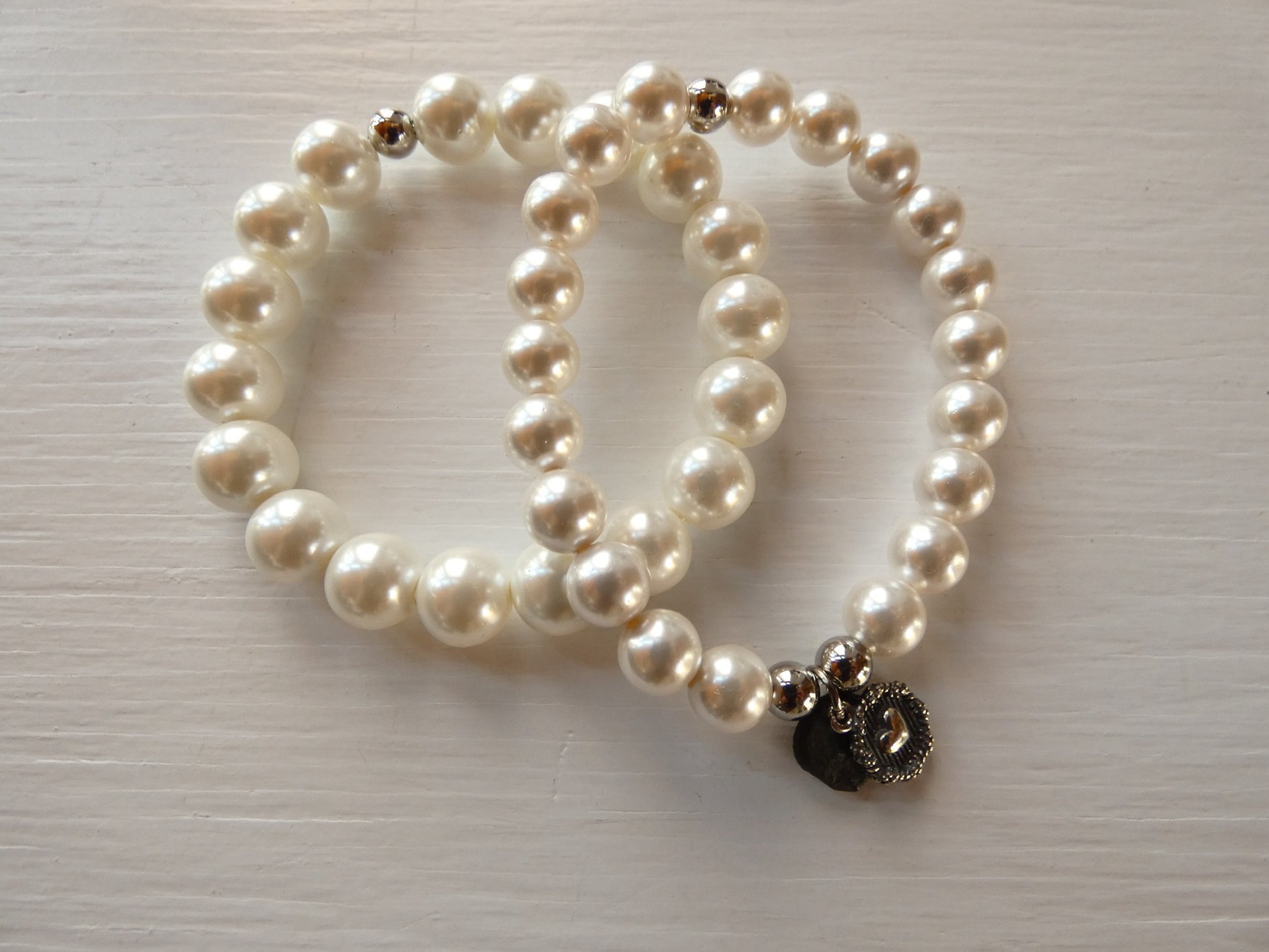 This set of two shell pearl bracelets is comprised of one 10 mm shell pearl bracelet & one 8 mm shell pearl bracelet with a sterling silver & cubic zirconia heart charm. A 6 mm round stainless steel bead accents each of the solid stone bracelets, as well as the lakeshore rock pendant. Each bracelet strand length is approximately 7”.