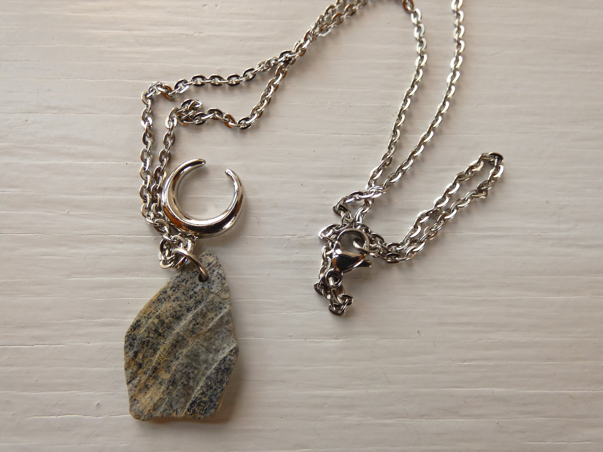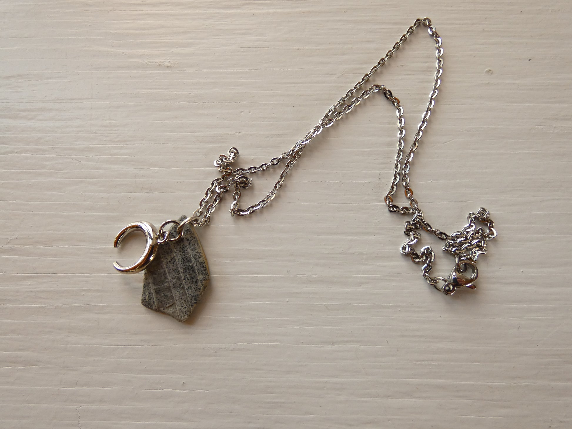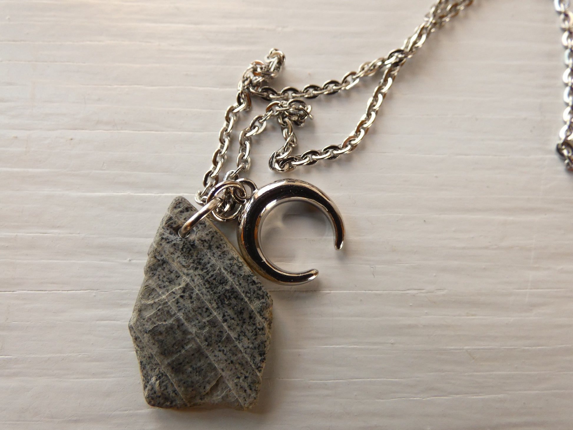 This unique charm cluster necklace includes a sterling silver half moon horn charm & a signature lakeshore rock pendant from @pannamint.cottage. It comes on a 16” stainless steel cable chain.