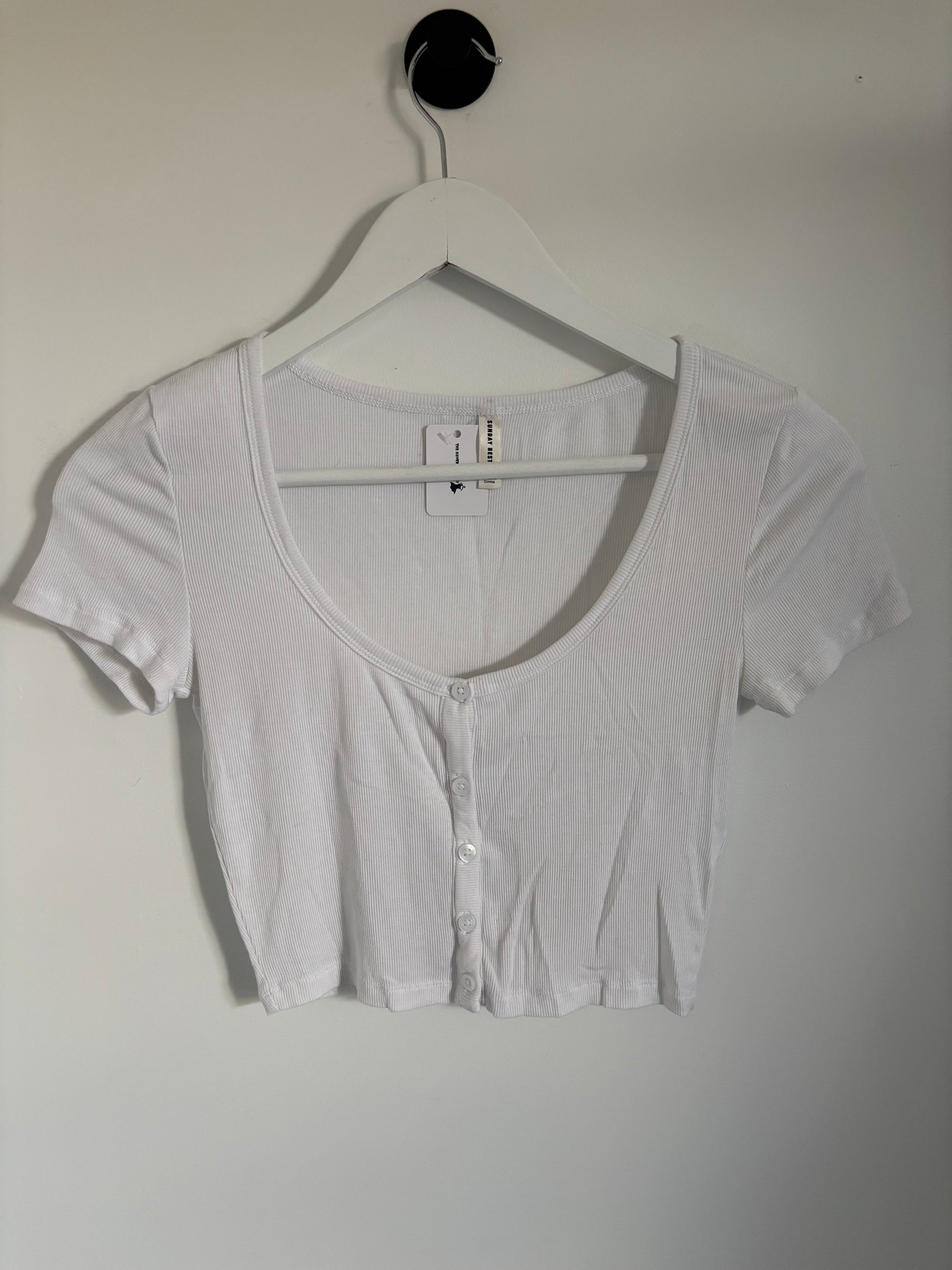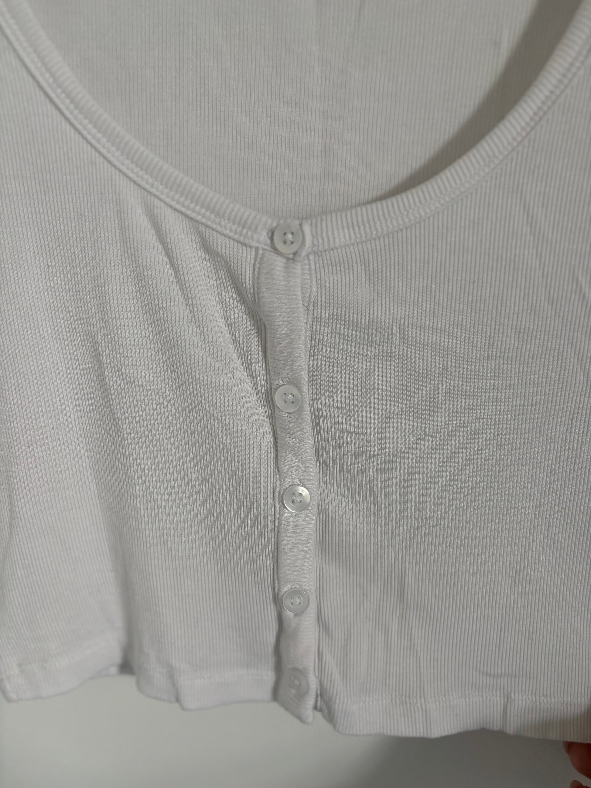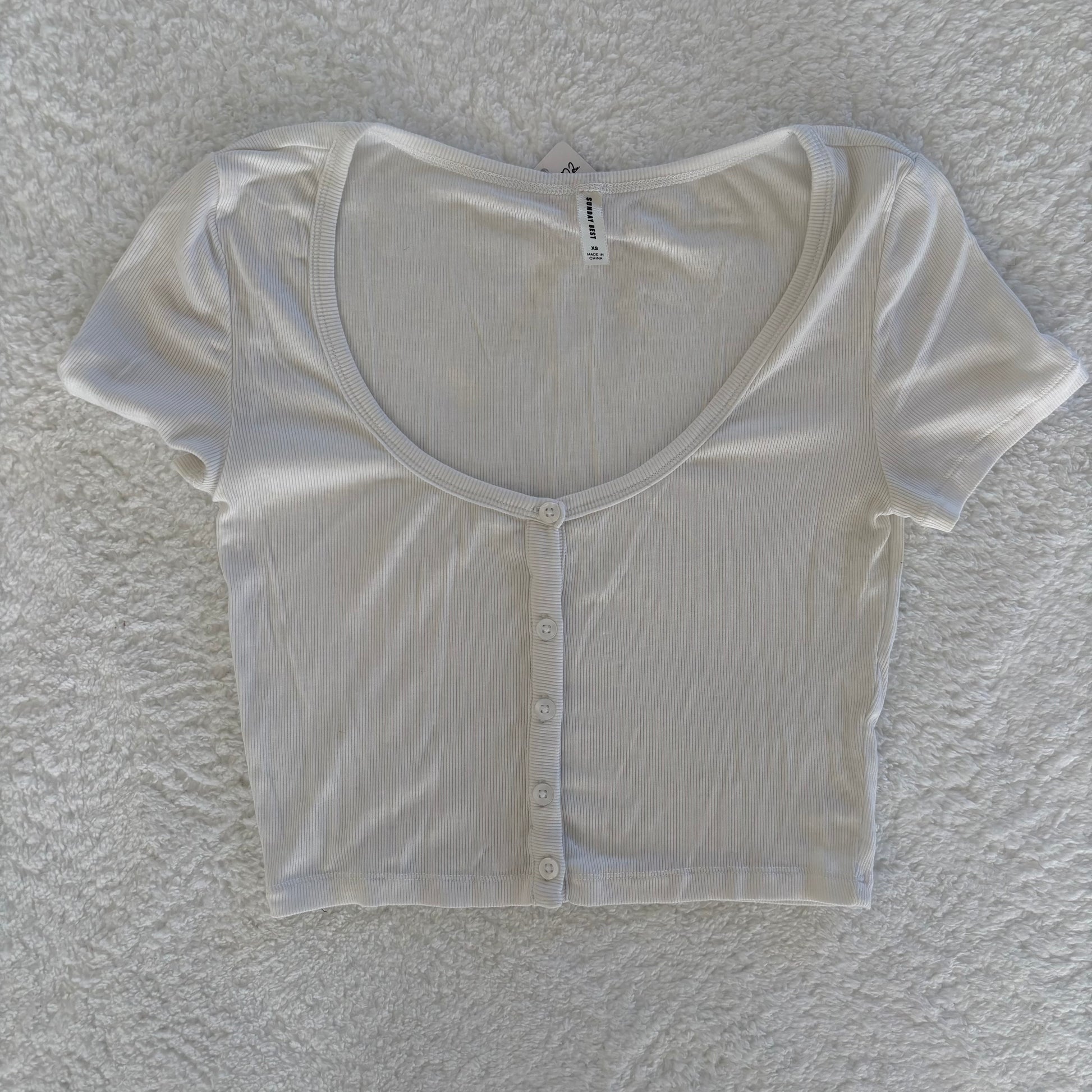 Sunday Best Holly top from Aritzia. In birch white. Lightweight ribbed fabric, cropped shirt with short sleeves, a scoop neckline, and a functional button up front (real buttons).